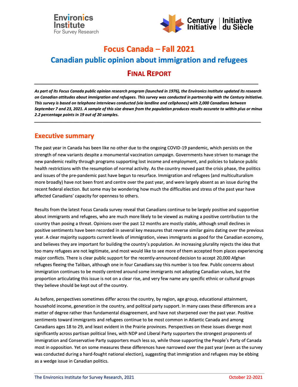 This survey was conducted in partnership with the Century Initiative. This survey is based on telephone interviews conducted (via landline and cellphones) with 2,000 Canadians between September 7 and 23, 2021 A sample of this size drawn from the population produces results accurate to within plus or minus 2.2 percentage points in 19 out of 20 samples.